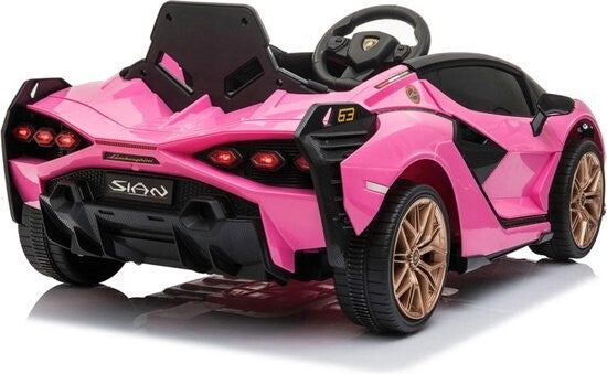 Deze prachtige kinderauto is geproduceerd onder licentie van Lamborghini. De Lamborghini Sian accu voertuig is voorzien van dubbele 12 volt aandrijvingen en rijdt met 3 verstelbare snelheden tussen de 2 en 4,5 km per uur. Verder heeft de kinderauto 2 echte vleugeldeuren, lederzitje, volledig rubberen banden, USB- en MP3-ingang voor eigen muziek, ledverlichting en meer. Met de “soft start” functie voelen kinderen geen schokje bij het optrekken. De snelheid wordt stapsgewijs opgevoerd. Op de 2.4 GHz afstandsbediening kunt u de kinderauto besturen, snelheid instellen en de auto op afstand pauzeren als het moet.