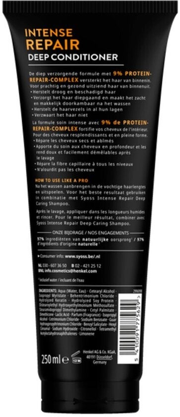 Met meer dan 45 jaar ervaring in haarverzorging zijn Syoss haarproducten ontwikkeld voor professionele resultaten. De diep verzorgende formule met 9% PROTEIN-REPAIR-COMPLEX versterkt het haar van binnenuit, voor prachtig en gezond uitziend haar. Deze deep conditioner herstelt droog en beschadigd haar, verzorgt het diepgaand en maakt het zacht en makkelijk doorkambaar na het wassen. Het herstelt de haarvezels in al hun lagen, zonder het haar te verzwaren.